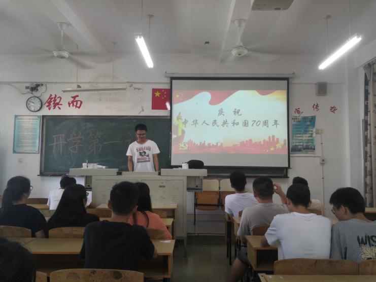 讲座内容分为两个部分,首先班长向全体同学讲解了“中华人民共和国70周年”相关历程,激励同学的爱国主义热忱,弘扬爱国主义精神,培养历史责任感,使命感和高尚的爱国情操及增强大学生责任意识。