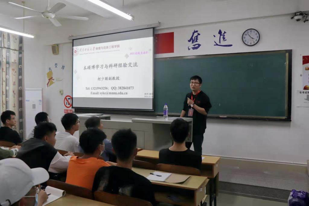 柯少颖博士是光电学院08级光电专业的学生,2012年本科毕业考上云南大学材料加工工程专业研究生,2015年硕士毕业考上厦门大学微电子与固体电子学博士研究生,2019年博士研究生毕业后,到闽南师范大学工作至今。现在是闽南师范大学物理与信息工程学院的副授,研究领域是半导体材料与光电子器件。在20周年校庆背景下结合自身的发展经历为在校的学弟学妹做讲座、开座谈会此次回到母校也开设了以“本硕博学习与科研经验交流”为主题的讲座,分享了自己分别在本科、硕士、博士三个阶段的经历与心得,教导同学们不应安于现状,要勇于挑战自我,不断向更高处迈进。此外还介绍了由他本人负责的光电子材料与器件集成实验室、微电子工艺实验室的概况与研究成果等。使同学们都受益匪浅,加深了对本专业知识的了解,更加明确了今后的发展。
